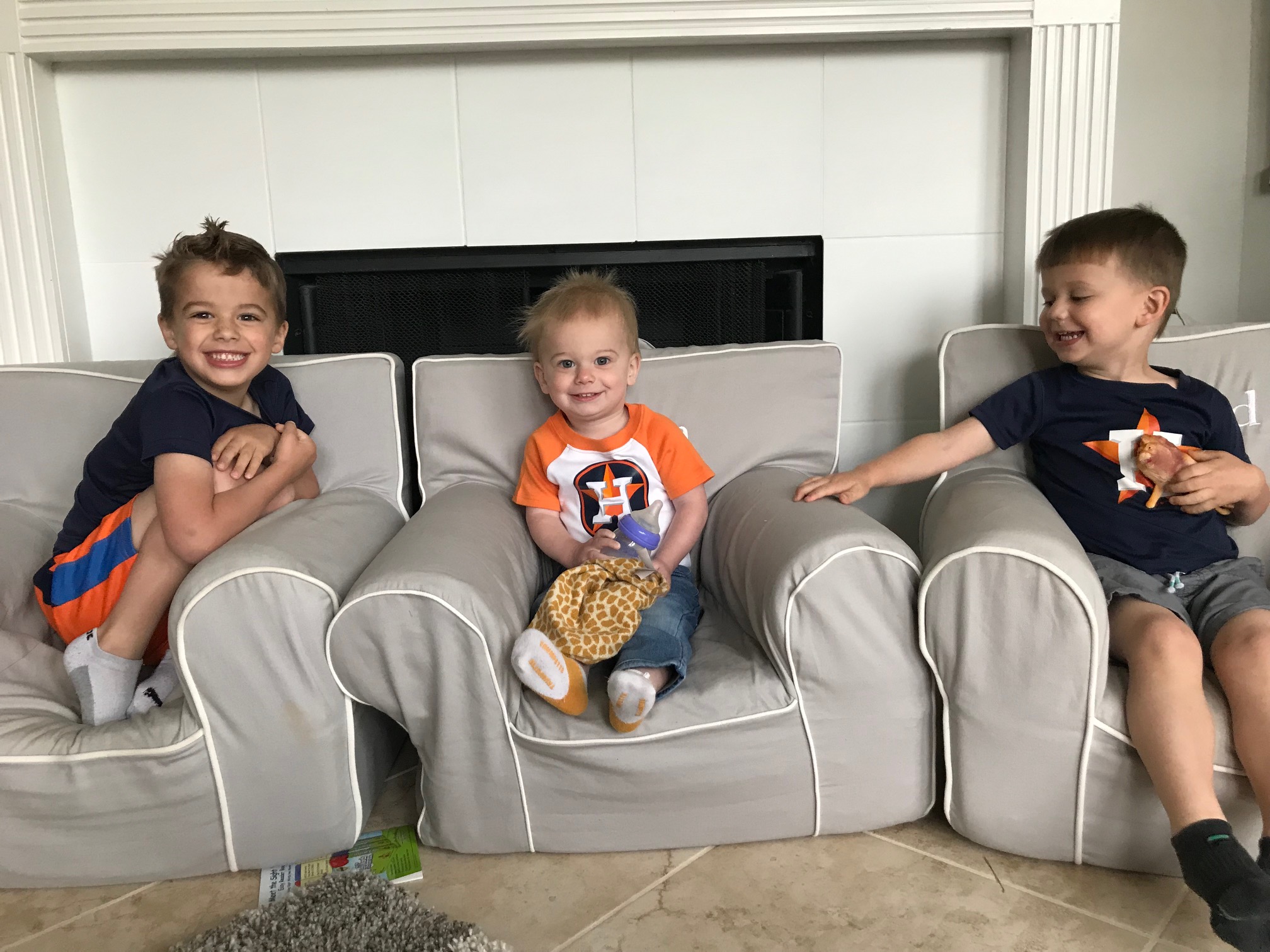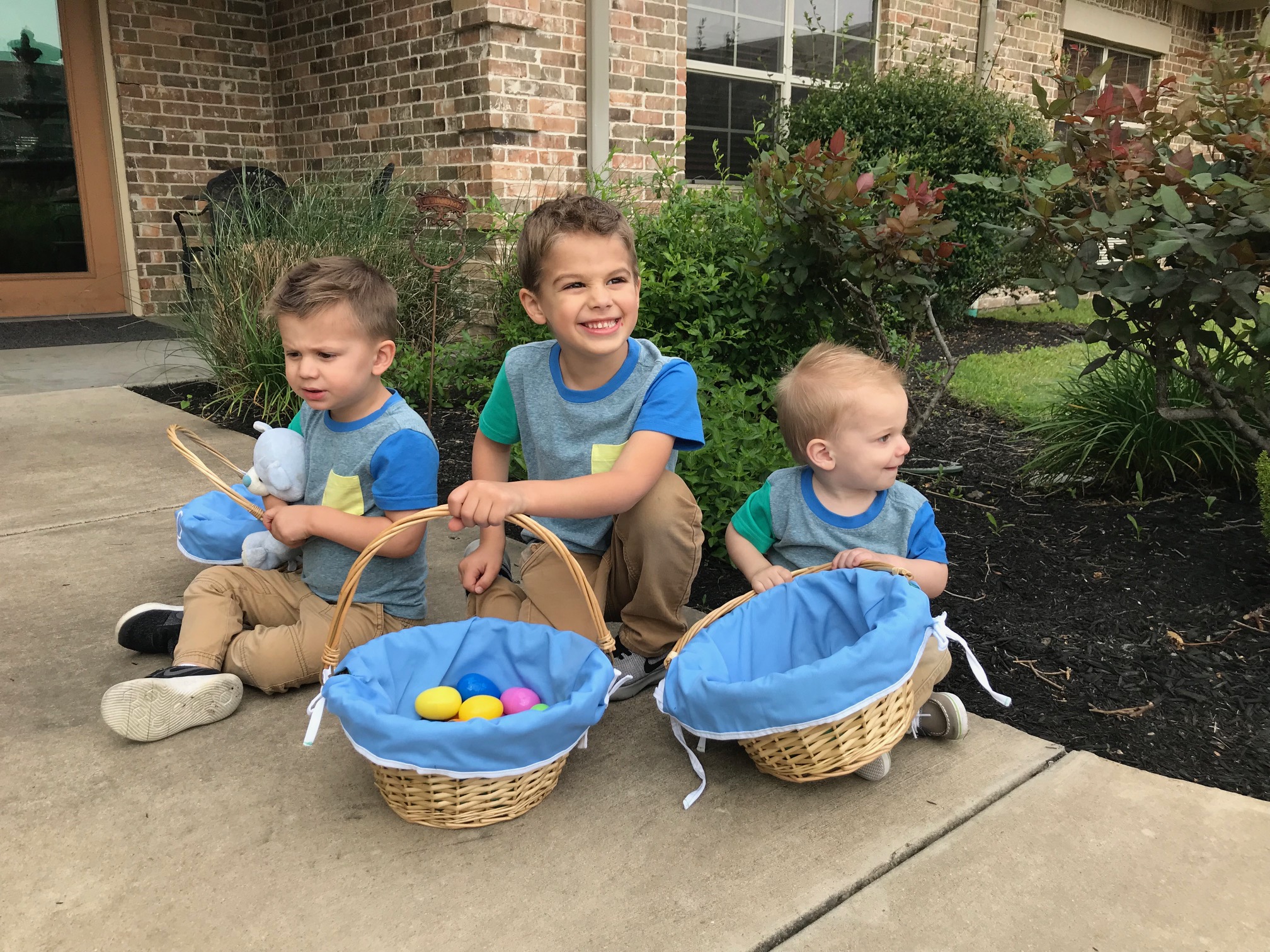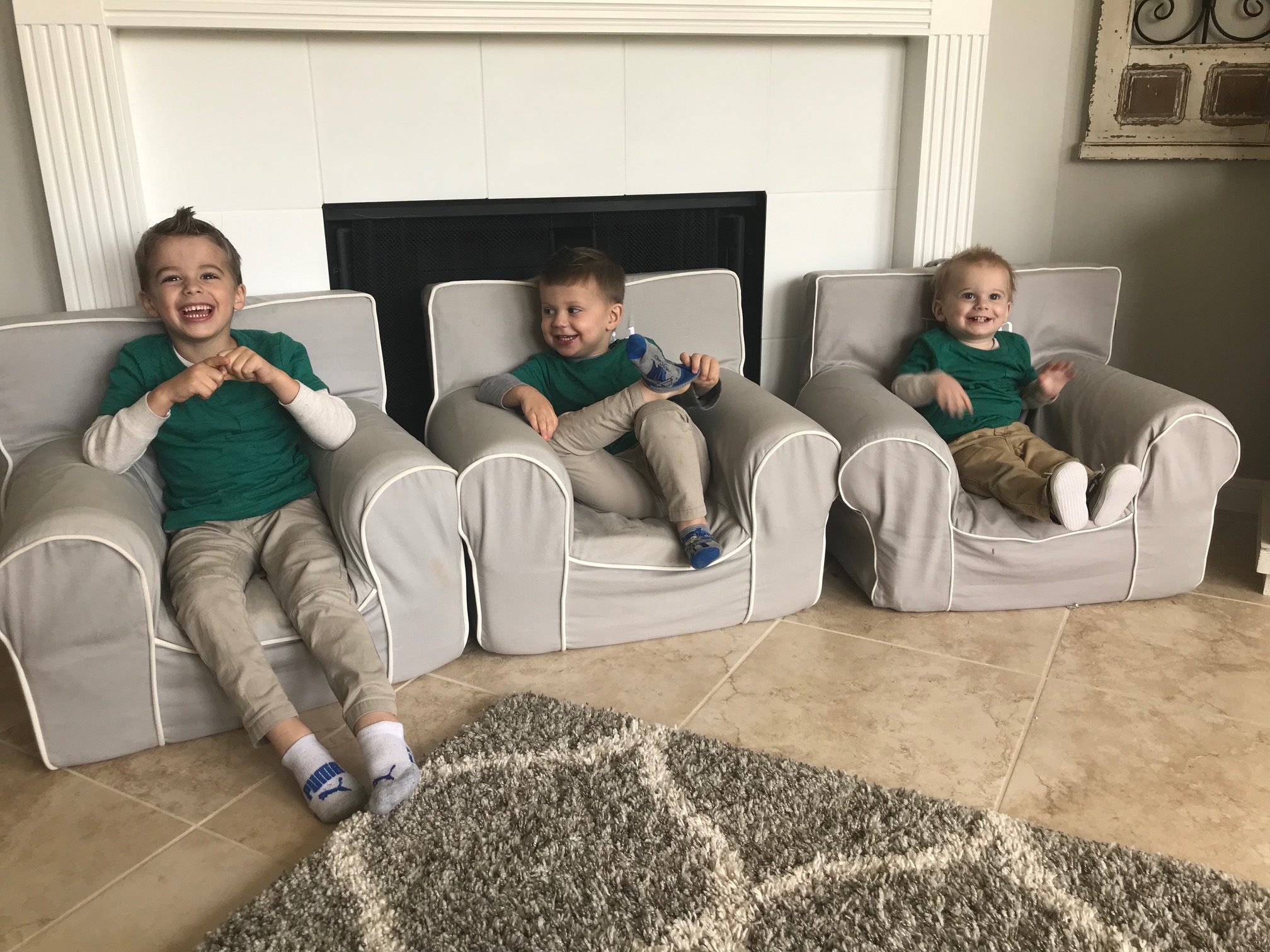 Since C is wearing 5T clothing, it’s the last time for a while all three boys will be all in the same department, so I’m taking advantage of this time by making them match as much as possible. It also makes it so much easier to spot them when we are in a big public place like a trampoline park or other big play place- I can constantly scan the crowd for the 3 boys in the shark shirt, or whatever they happen to be wearing.