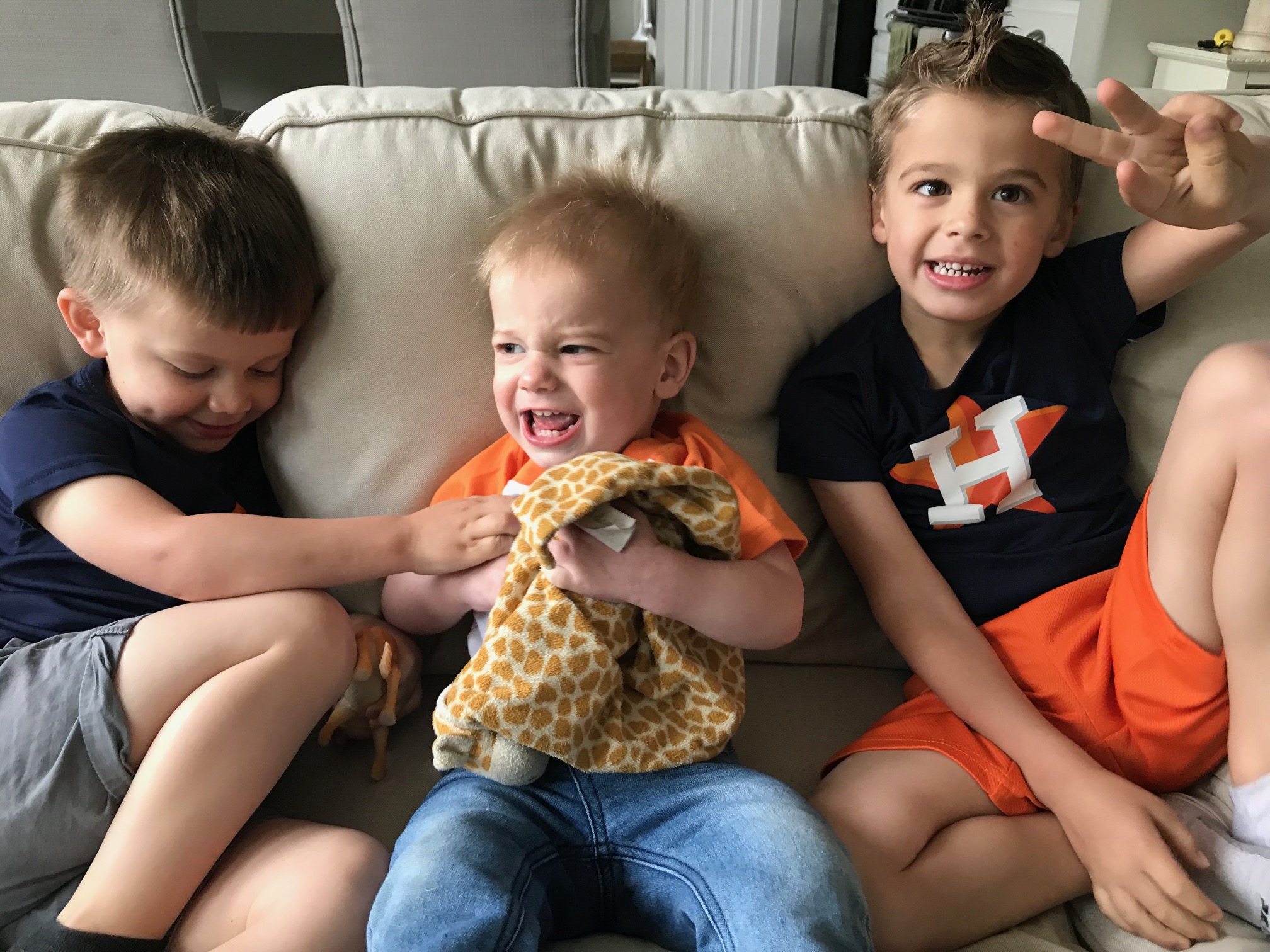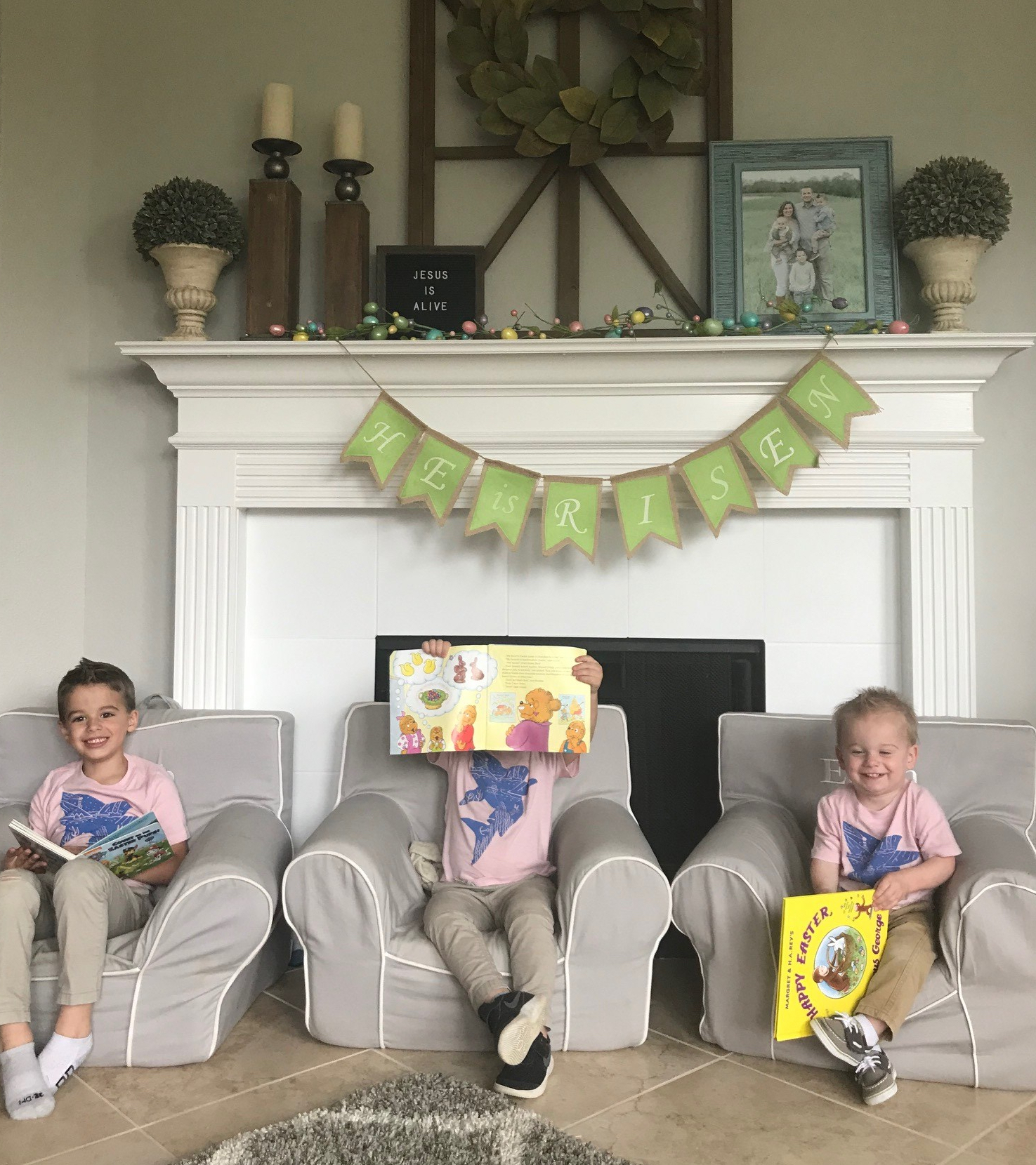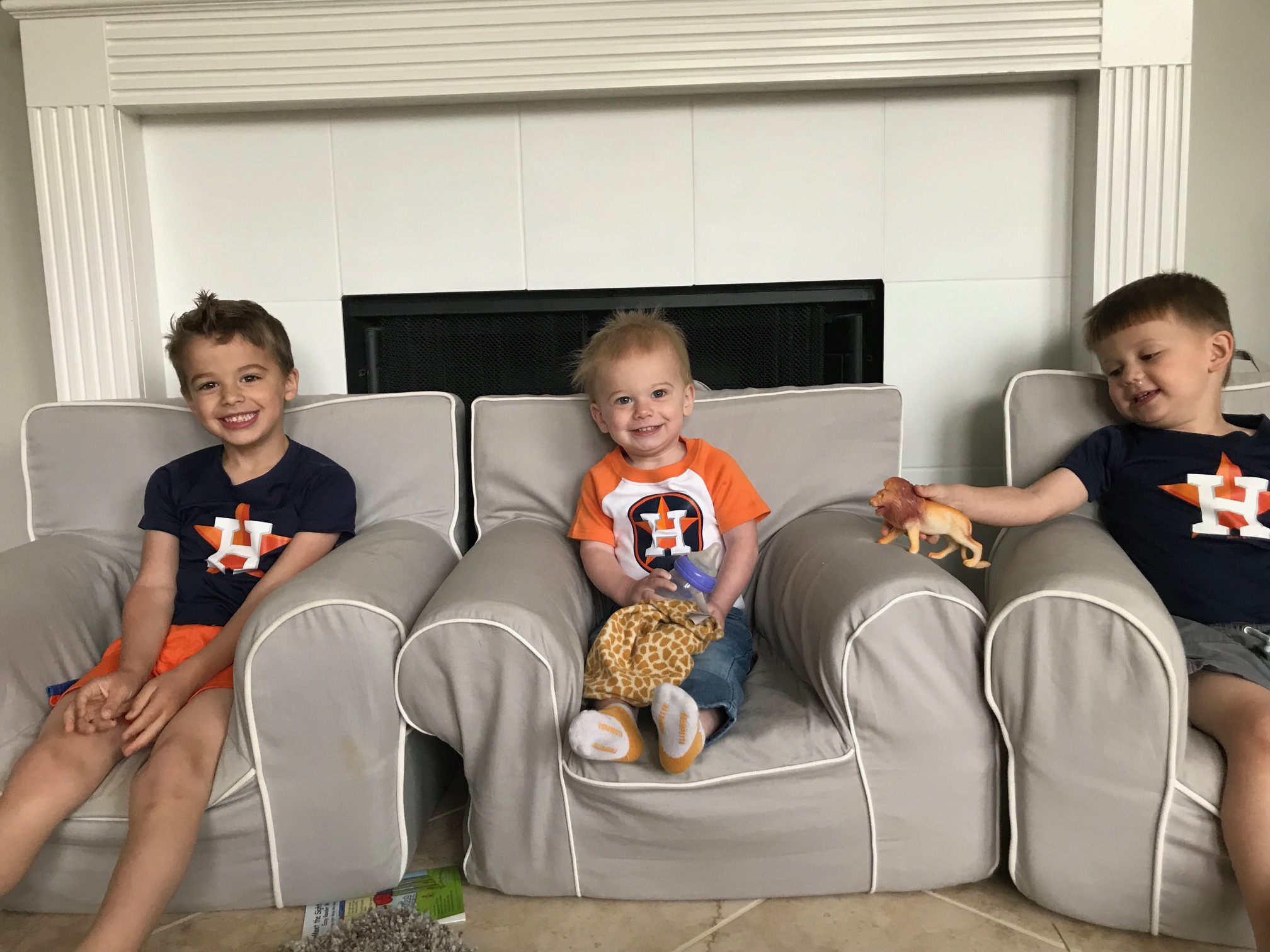 Since C is wearing 5T clothing, it’s the last time for a while all three boys will be all in the same department, so I’m taking advantage of this time by making them match as much as possible. It also makes it so much easier to spot them when we are in a big public place like a trampoline park or other big play place- I can constantly scan the crowd for the 3 boys in the shark shirt, or whatever they happen to be wearing.