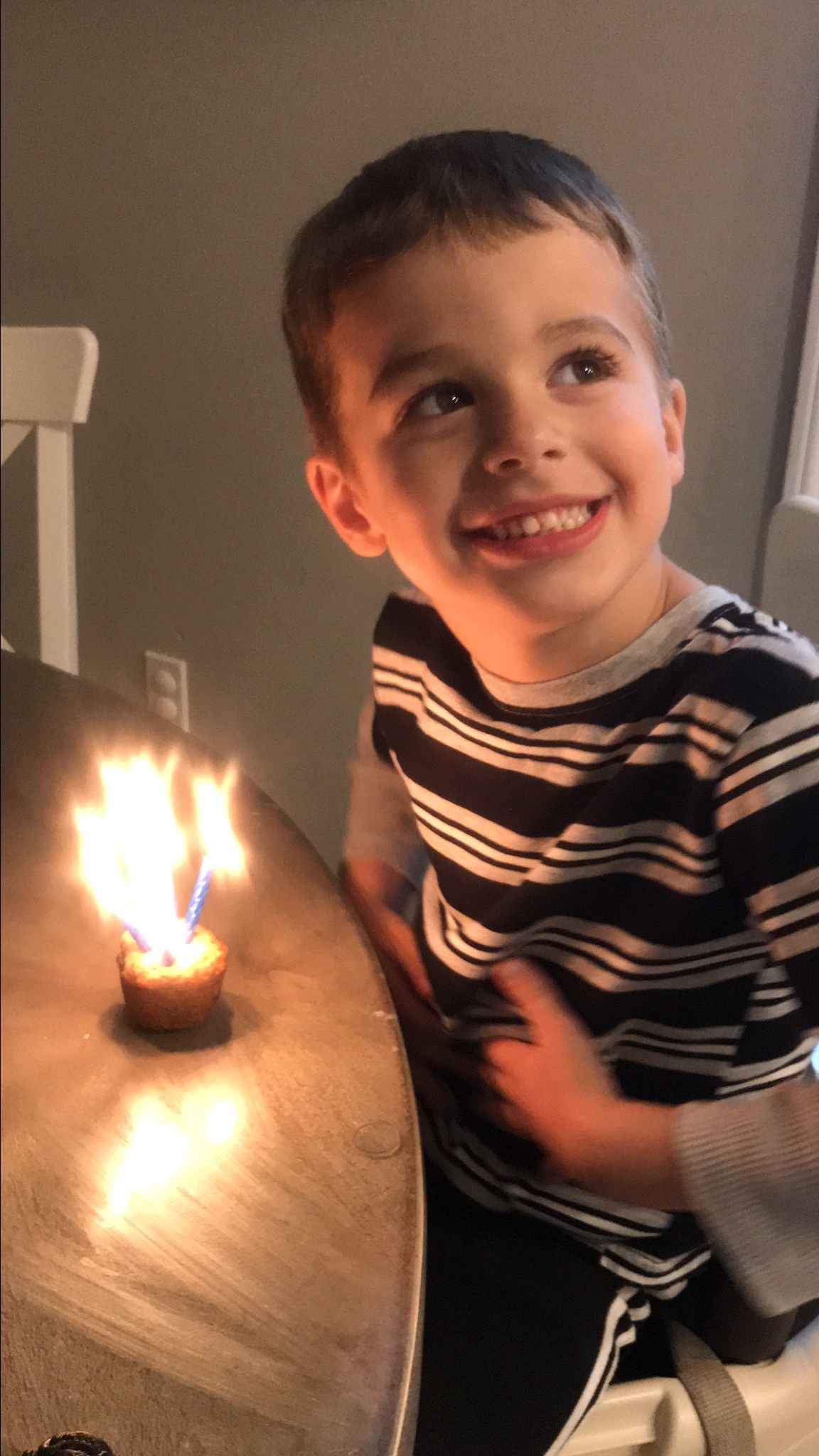 Caleb turned 4.5 about a month later and we’ve made it a tradition the last couple years to sing to our boys on their half birthday by cutting a candle in half. So we stuck 4 and a half candles in a banana chocolate chip muffin, sang and called it a day.