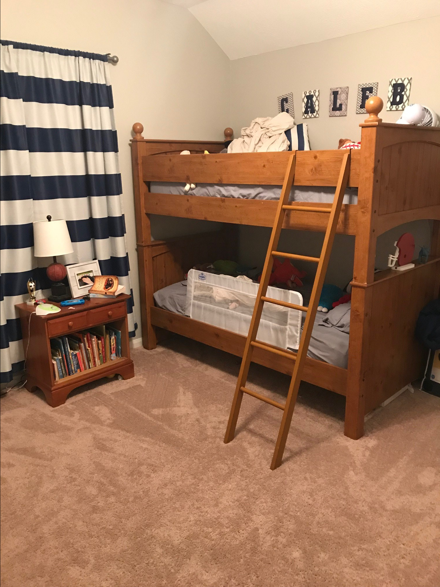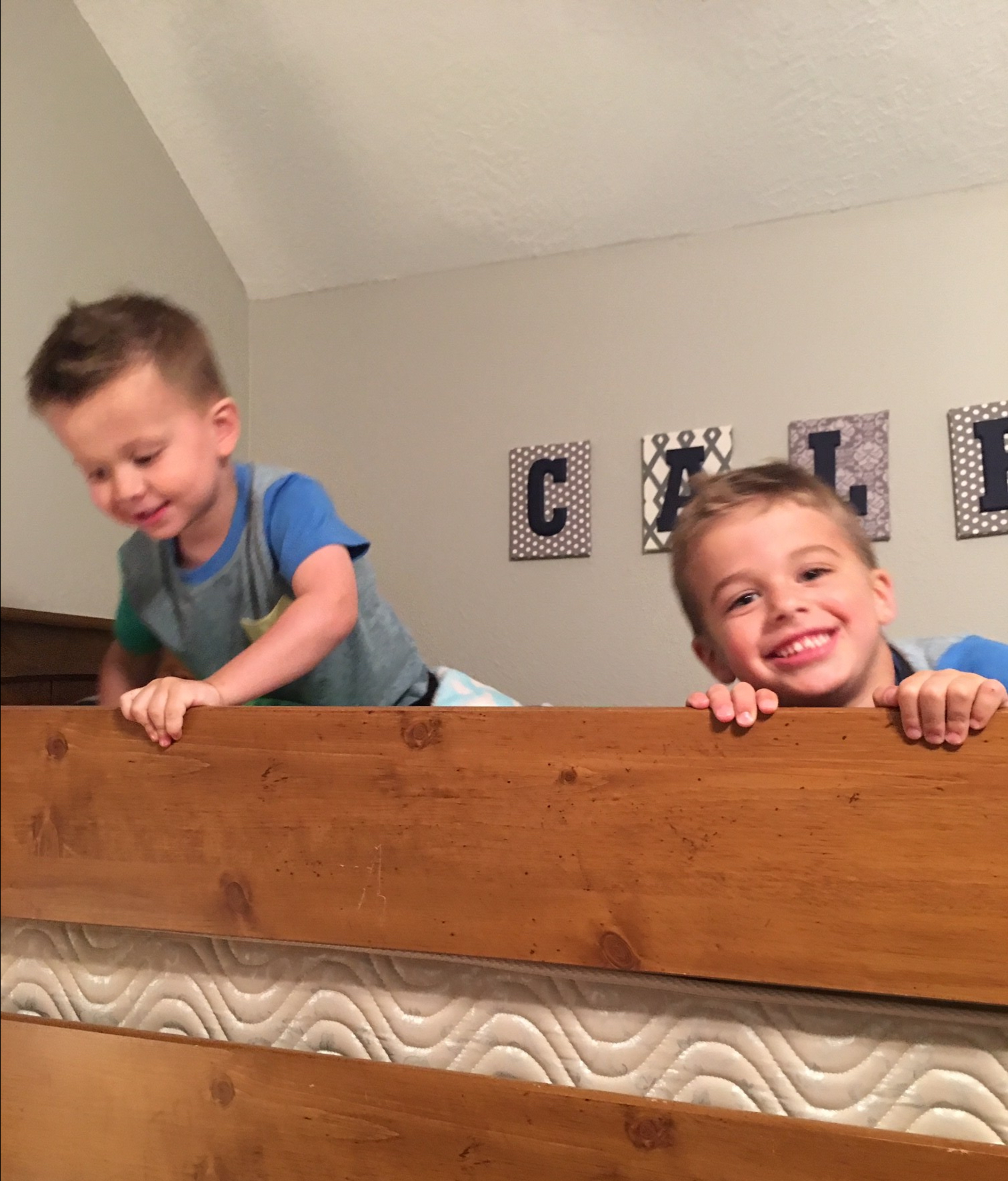 Funny story: we bought these beds when Caleb was 15 months old- about 3 years ago. We set up one (they can be two twins or bunk beds) in his room, next to his crib just in case he decided to climb out of his crib when his baby brother was born a couple months later, and we kept the other in the garage. We kept waiting for C to climb out of his crib, but he never did. So we got two cribs (best money spent!) and both boys slept in their cribs until just a week or so, ago. We actually have three cribs in our house because we were in a very similar situation when baby E came along and D being under two. No matter how much we talked up his big boy bed, C (4.5!) refused to sleep in it with out a ton of tears. We didn’t want to force him because there really wasn’t a reason to, but thankfully setting up the bunk bed did the trick. Now the boys can share a room (when they want to, which so far has been every night). I love hearing their sweet little voices talk back and forth with one another. The only downfall is they have been waking up quite a bit earlier than when they were in their own rooms. In fact, it’s been so early compared to their normal, we are contemplating moving David back to his room.